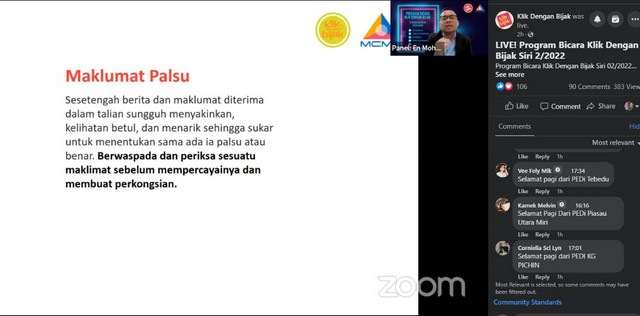 13 April 2022 | Aktiviti Terkini12 April 2022, Selasa – Staff PEDi Presint 18 telah mengikuti Program Bicara Klik Dengan Bijak Siri 2/2022- Maklumat Palsu. Program ini telah diadakan secara maya di Facebook Klik Dengan Bijak. Moderator untuk program ini ialah Ts Md Tahir Musa, Timbalan Pengarah Jabatan Program Komuniti, MCMC. Manakala penceramah pula ialah Encik Mohd Mui’zzuddin Rengga, Penolong Pengarah Pejabat MCMC Negeri Sarawak.