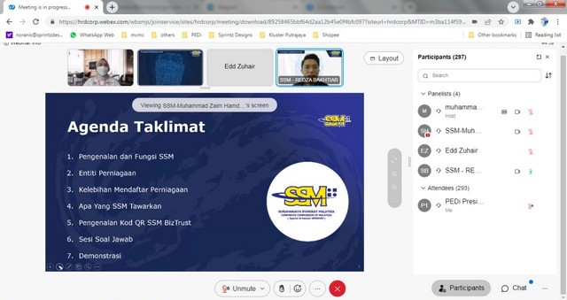 Program ini diadakan pada 23 Mac 2022, Rabu yang lalu bermula pada jam 10.00 pagi hingga 11.30 pagi. Sesi taklimat ini untuk memudahkan usahawan PEDi untuk mendapatkan bantuan dalam segala urusan berkaitan SSM seperti pendaftaran perniagaan, penambahan jenis perniagaan, pembaharuan lesen perniagaan dan penamatan lesen perniagaan yang disediakan didalam laman web SSM di PEDi terdekat