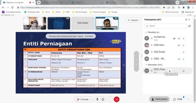 12 Mac 2022 | Aktiviti Terkini24 Mac 2022, Khamis – Seramai lebih 400 orang usahawan dan staf PEDi telah menyertai Taklimat SSM Khas Buat Usahawan Jana'preneur & Pedi secara atas talian oleh SSM. Program ini merupakan kerjasama Pembangunan Sumber Manusia Berhad (HRD CORP) bersama-sama Suruhanjaya Syarikat Malaysia (SSM) menganjurkan webinar untuk pendaftaran Skim Pendaftaran Perniagaan Prihatin (SPPP). Para usahawan Pusat Ekonomi Digital (PEDi) di seluruh negara telah dijemput untuk menyertai program ini.