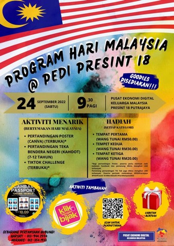 27 September 2022 | Aktiviti Terkini25 September 2022, Ahad – Pusat Ekonomi Digital, PEDi Presint 18 telah mengadakan Program Hari Malaysia @ PEDi Presint 18. Program ini sempena meraikan sambutan Hari Malaysia pada 16 September yang lalu. Selain itu, untuk memberi pendedahan mengenai program yang telah dan akan dijalankan oleh PEDi seperti latihan keusahawanan dan ICT, serta Klik Dengan Bijak iaitu keselamatan penggunaan internet kepada komuniti setempat. Program ini juga berkolaborasi bersama staf PEDi Putrajaya di Presint 9 Fasa 10 dan Presint 9 Fasa 3.