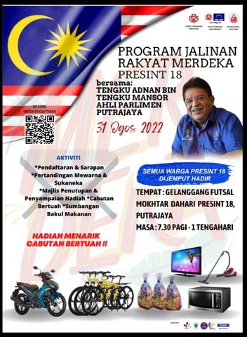 1 September 2022 | Aktiviti Terkini31 Ogos 2022, Rabu – Bersempena sambutan kemerdekaan Ke-65 tahun ini, Pusat Ekonomi Digital (PEDi) Putrajaya yang terdiri daripada PEDI Presint 16, PEDI Presint 18, PEDI Presint 9 Fasa 3 dan PEDI Presint 9 Fasa 10 yang turut dibantu oleh Sukarelawan MIV 2022 telah menyertai Program “JALINAN RAKYAT MERDEKA PRESINT 18" dengan kerjasama Kawan Rukun Tertangga (KRT) Presint 18 yang dirasmikan oleh YBrs. Tengku Adnan Bin Tengku Mansor (Ahli Parlimen WP Putrajaya). Program berlangsung di Gelanggang Futsal Mokhtar Dahari Presint 18, Putrajaya dan telah bermula pada pukul 7.00 pagi sehingga 1.00 tengahari yang dihadiri lebih 1000 penduduk Presint 18 dan sekitarnya.