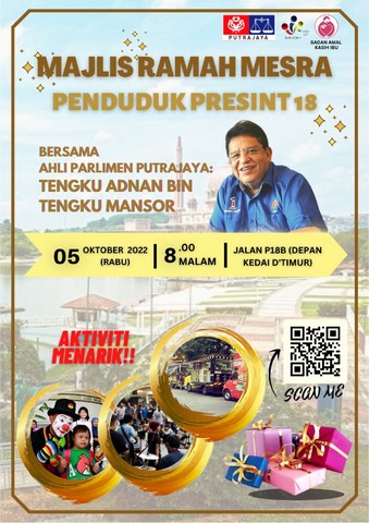 6 Oktober 2022 | Aktiviti Terkini05 Oktober 2022, Rabu – Komuniti Presint 18 dengan jayanya telah mengadakan Majlis Ramah Mesra Ahli Parlimen Putrajaya, YB Datuk Seri Tengku Adnan bin Tengku Mansor di Presint 18 anjuran bersama MPP Putrajaya, UMNO Putrajaya dan Badan Amal Kasih Ibu. Program ini merupakan program sambutan hari jadi komuniti Presint 18 dan diadakan untuk menjalinkan ukhwah sesama penduduk sekitar.