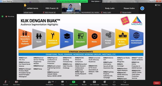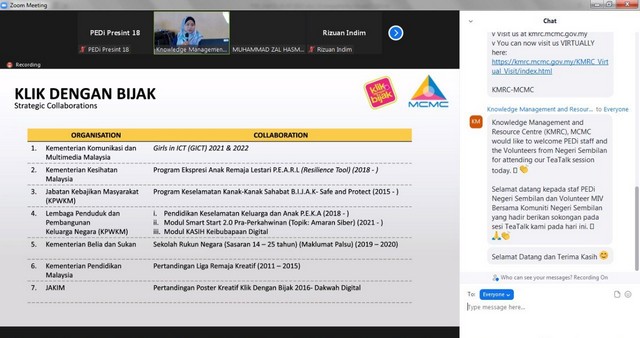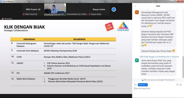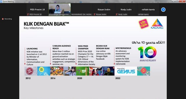 15 September 2022 | Aktiviti Terkini14 September 2022, Rabu – Staf PEDi Presint 18 telah mengikuti Program TeaTalk Klik Dengan Bijak (KDB). Program ini merupakan anjuran MCMC dan telah diadakan secara maya menggunakan pautan Zoom. Penceramah untuk program ini ialah Puan Hashimah Hashim, Ketua Jabatan Program Komuniti, MCMC. Initipati program ini adalah mengenai perkongsian program-program Klik Dengan Bijak yang telah dijalankan oleh MCMC setelah 10 tahun ia dilancarkan iaitu sejak 1 Julai 2012. Selain itu, perkongsian mengenai kolaborasi MCMC dengan pelbagai agensi kerajaan, swasta dan juga institut pengajian tinggi. Program Klik Dengan Bijak juga telah mendapat anugerah antarabangsa iaitu WSIS Forum 2020 untuk kategori 10. Program diakhiri dengan sesi kuiz bersama peserta. Program ini diadakan selama satu jam bermula 11.00 pagi dan berakhir pada jam 12.00 tengahari.