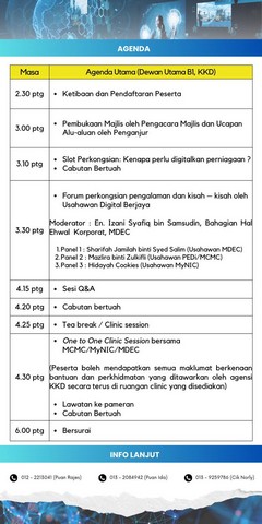4 November 2023 | Aktiviti Terkini03 November 2023, Jumaat – Kementerian Komunikasi dan Digital, KKD telah menganjurkan Program Usahawan Digital @ KKD bagi tahun 2023. Objektif program ini adalah untuk mentransformasikan usahawan-usahawan jualan harian ke arah perniagaan secara digital dan meningkatkan penggunaan aplikasi digital dalam perniagaan. Antara pengisian program adalah Slot perkongsian ‘Kenapa perlu digitalkan perniagaan?’, Forum perkongsian pengalaman dan kisah-kisah oleh Usahawan Digital Berjaya (Usahawan MDEC, PEDi/MCMC, MyNIC), Sesi soal jawab, cabutan bertuah dan One to One Clinic Session (MCMC, MyNIC & MDEC).