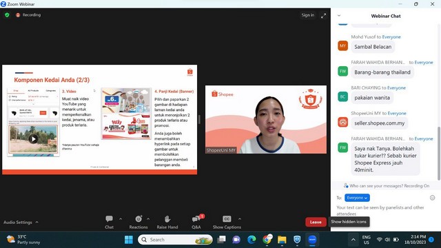 Tajuk latihan pada kali ini adalah ‘Tingkatkan Taraf Kedai Shopee Anda’. Dalam sesi latihan yang disediakan, usahawan akan belajar aspek-aspek seperti berikut; perhiasan kedai, iklan dan kempen, penyertaan program Shopee, pemenuhan pesanan, akaun & penerimaan pembayaran. Usahawan PEDi telah mengikuti program ini secara atas talian menggunakan Zoom di PEDi Presint 18 bermula jam 2.00 petang hingga 3.30 petang.