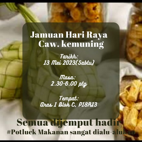 14 Mei 2023 | Aktiviti Terkini13 May 2023, Sabtu - Telah berlangsungnya Program Jamuan Hari Raya Aidilfitri Cawangan Kemuning bersama Komuniti Presint 18 dan dimeriahkan lagi oleh Puan Husna Binti Abdul Rahaman, Ketua Wanita Bahagian Putrajaya. Program ini merupakan program anjuran bersama KRT Presint 18R13. Program ini merupakan acara tahunan bersempena sambutan Aidilfitri setiap tahun di Putrajaya.