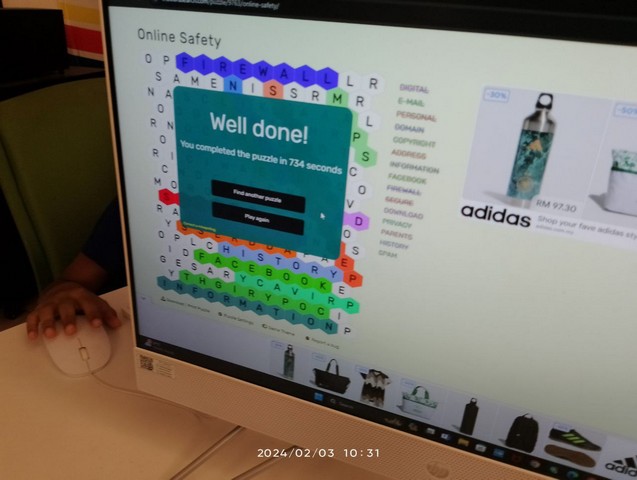 Seterusnya, aktiviti e-learning educational wordsearch bertajuk ‘Online Safety’ untuk pelajar. Pelajar yang menyertai kelas ini perlu mencari perkataan tersembunyi bertemakan keselamatan internet. Kelas diadakan bermula jam 10.00 pagi hingga 12.00 tengahari.