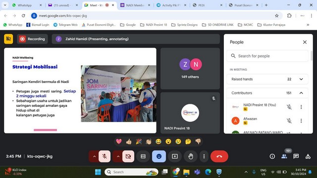 31 Oktober 2024 | Aktiviti Terkini30 Oktober 2024, Rabu – Webinar Wellbeing Support telah diadakan secara atas talian kepada petugas NADI di seluruh negara. Petugas diberi penerangan mengenai perkhidmatan baru yang akan disediakan di NADI iaitu saringan kesihatan seperti pemeriksaan BMI, tekanan darah dan bacaan gula dalam darah. Program ini untuk meningkatkan kesedaran komuniti mengenai kepentingan penjagaan kesihatan diri melalui pemeriksaan berkala. Seterusnya sesi soal jawab diadakan untuk membantu petugas mengenai isu dan permasalahan mengenai program saringan kesihatan.