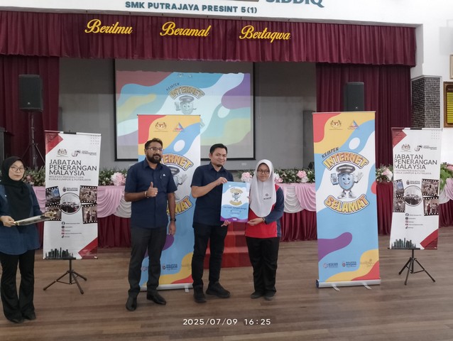 10 Julai 2025 | Aktiviti Terkini9 Julai 2025, Rabu – Pihak Jabatan Penerangan Malaysia (JAPEN) dengan kerjasama Kelab Malaysiaku telah menganjurkan Program Kempen Internet Selamat bertemakan Keselamatan Dalam Talian dan Buli Siber yang telah diadakan di SMK Presint 5(1). Program ini menampilkan wakil dari NADI Putrajaya sebagai penceramah utama dan berlangsung dari jam 2.30 petang hingga 6.00 petang. Seramai 69 orang pelajar serta 7 orang guru telah menghadiri program ini.
