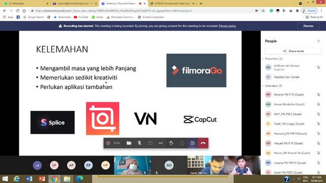 12 September 2021 | Aktiviti Terkini11 September 2021, Sabtu - Pengurusan Pusat Internet Komuniti (PIK) iaitu Sprintz Designs Sdn. Bhd. menganjurkan kursus secara atas talian bertajuk Kursus Videografi untuk staf Pusat Internet Komuniti (PIK) daripada Putrajaya dan Linggi. Kursus Videografi menggunakan telefon pintar telah dihadiri oleh 9 orang staf dari Pusat Internet Komuniti (PIK) Presint 9 Fasa 3, Presint 9 Fasa 10, Presint 16, Presint 18 dan Linggi.