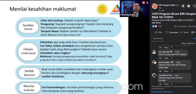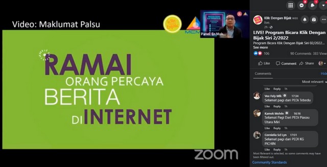 13 April 2022 | Aktiviti Terkini12 April 2022, Selasa – Staff PEDi Presint 18 telah mengikuti Program Bicara Klik Dengan Bijak Siri 2/2022- Maklumat Palsu. Program ini telah diadakan secara maya di Facebook Klik Dengan Bijak. Moderator untuk program ini ialah Ts Md Tahir Musa, Timbalan Pengarah Jabatan Program Komuniti, MCMC. Manakala penceramah pula ialah Encik Mohd Mui’zzuddin Rengga, Penolong Pengarah Pejabat MCMC Negeri Sarawak.