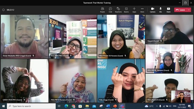 24 November 2022 | Aktiviti Terkini23 November 2022, Rabu – Pengurusan Pusat Ekonomi Digital (PEDi) iaitu Sprintz Designs Sdn. Bhd telah mengadakan latihan secara atas talian bertajuk ‘Teamwork That Works’ untuk staf Pusat Ekonomi Digital (PEDI) Putrajaya dan Linggi. Latihan ini telah dihadiri oleh 9 orang staf dari Pusat Ekonomi Digital (PEDI) Presint 9 Fasa 3, Presint 9 Fasa 10, Presint 16, Presint 18 dan Linggi.