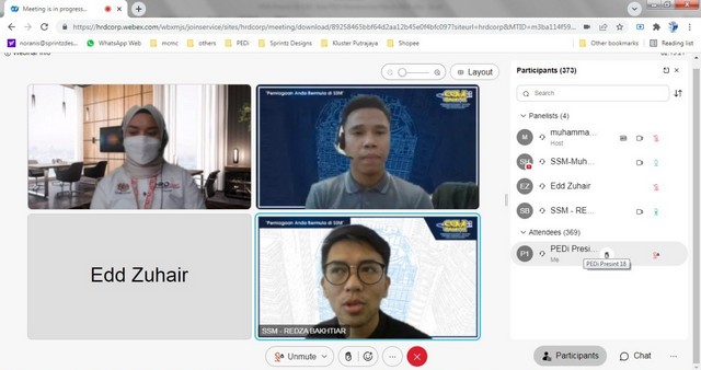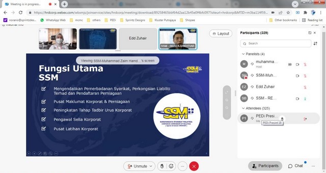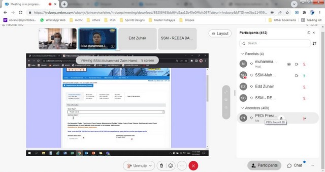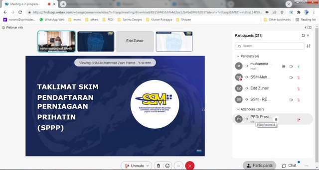 12 Mac 2022 | Aktiviti Terkini24 Mac 2022, Khamis – Seramai lebih 400 orang usahawan dan staf PEDi telah menyertai Taklimat SSM Khas Buat Usahawan Jana'preneur & Pedi secara atas talian oleh SSM. Program ini merupakan kerjasama Pembangunan Sumber Manusia Berhad (HRD CORP) bersama-sama Suruhanjaya Syarikat Malaysia (SSM) menganjurkan webinar untuk pendaftaran Skim Pendaftaran Perniagaan Prihatin (SPPP). Para usahawan Pusat Ekonomi Digital (PEDi) di seluruh negara telah dijemput untuk menyertai program ini.