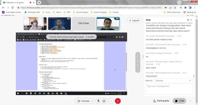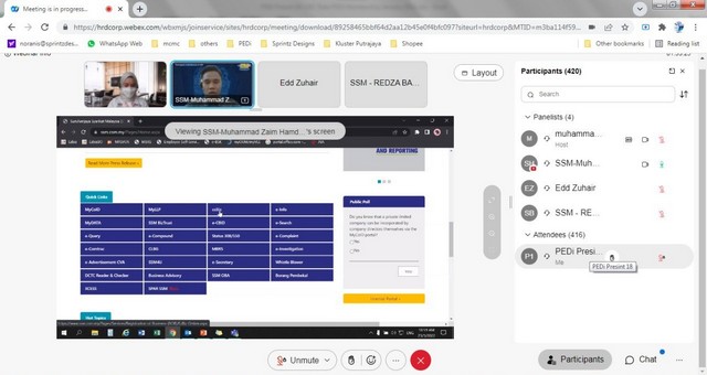 Sesi penerangan ini adalah secara atas talian melalui pihak SKMM dan pihak SSM sebagai tenaga pengajar. Antara pengisian taklimat seperti berikut;