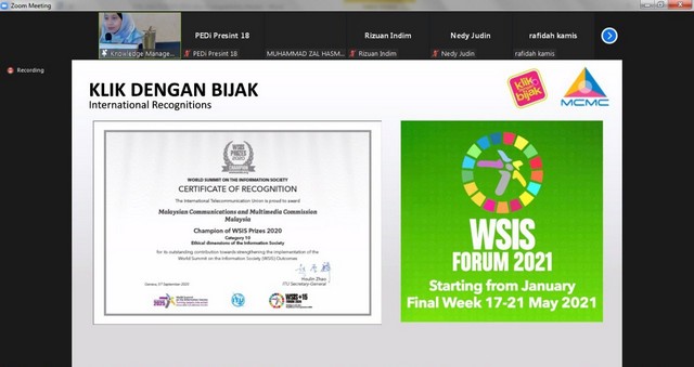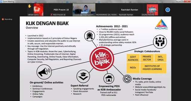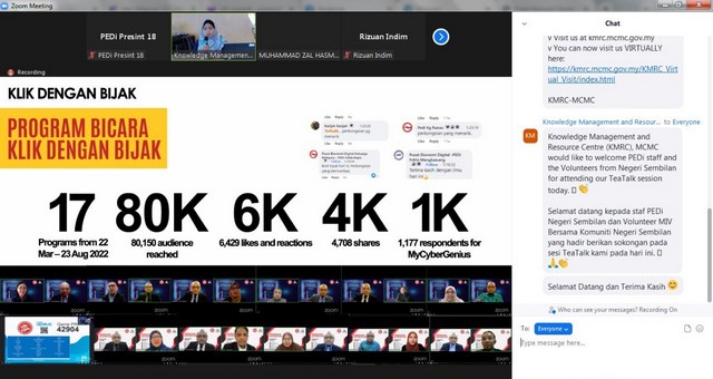 15 September 2022 | Aktiviti Terkini14 September 2022, Rabu – Staf PEDi Presint 18 telah mengikuti Program TeaTalk Klik Dengan Bijak (KDB). Program ini merupakan anjuran MCMC dan telah diadakan secara maya menggunakan pautan Zoom. Penceramah untuk program ini ialah Puan Hashimah Hashim, Ketua Jabatan Program Komuniti, MCMC. Initipati program ini adalah mengenai perkongsian program-program Klik Dengan Bijak yang telah dijalankan oleh MCMC setelah 10 tahun ia dilancarkan iaitu sejak 1 Julai 2012. Selain itu, perkongsian mengenai kolaborasi MCMC dengan pelbagai agensi kerajaan, swasta dan juga institut pengajian tinggi. Program Klik Dengan Bijak juga telah mendapat anugerah antarabangsa iaitu WSIS Forum 2020 untuk kategori 10. Program diakhiri dengan sesi kuiz bersama peserta. Program ini diadakan selama satu jam bermula 11.00 pagi dan berakhir pada jam 12.00 tengahari.