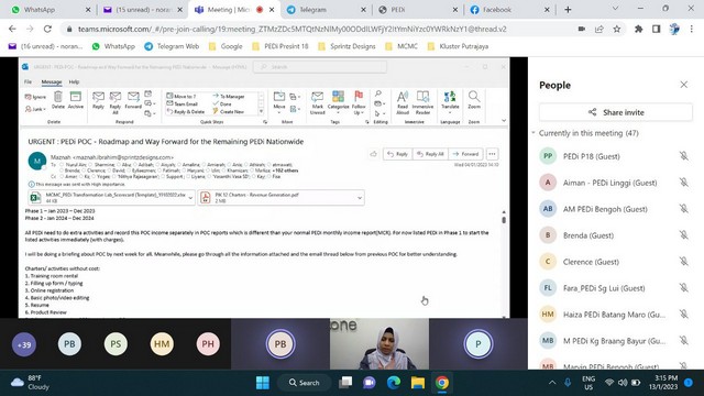 14 Januari 2023 | Aktiviti Terkini13 Januari 2023, Jumaat – Taklimat diadakan bertujuan untuk memaklumkan PEDi yang akan terlibat menjalani POC (Fasa 1 atau Fasa 2). Staf PEDi yang terlibat untuk Fasa 1 bermula Januari 2023 hingga Disember 2023 dan Fasa 2 bermula Januari 2024 hingga Disember 2024.