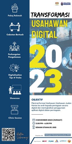 4 November 2023 | Aktiviti Terkini03 November 2023, Jumaat – Kementerian Komunikasi dan Digital, KKD telah menganjurkan Program Usahawan Digital @ KKD bagi tahun 2023. Objektif program ini adalah untuk mentransformasikan usahawan-usahawan jualan harian ke arah perniagaan secara digital dan meningkatkan penggunaan aplikasi digital dalam perniagaan. Antara pengisian program adalah Slot perkongsian ‘Kenapa perlu digitalkan perniagaan?’, Forum perkongsian pengalaman dan kisah-kisah oleh Usahawan Digital Berjaya (Usahawan MDEC, PEDi/MCMC, MyNIC), Sesi soal jawab, cabutan bertuah dan One to One Clinic Session (MCMC, MyNIC & MDEC).