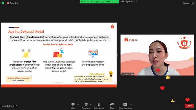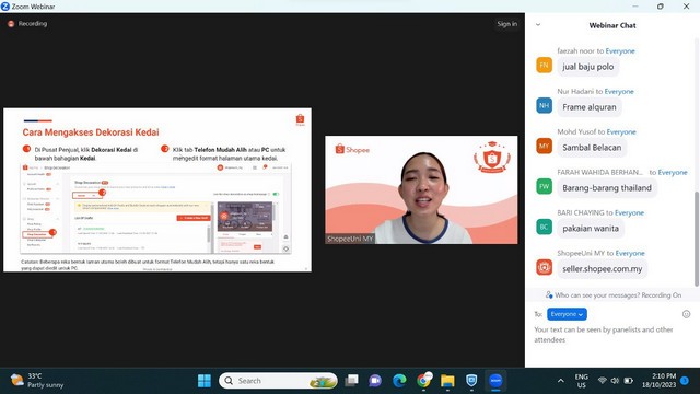 Tajuk latihan pada kali ini adalah ‘Tingkatkan Taraf Kedai Shopee Anda’. Dalam sesi latihan yang disediakan, usahawan akan belajar aspek-aspek seperti berikut; perhiasan kedai, iklan dan kempen, penyertaan program Shopee, pemenuhan pesanan, akaun & penerimaan pembayaran. Usahawan PEDi telah mengikuti program ini secara atas talian menggunakan Zoom di PEDi Presint 18 bermula jam 2.00 petang hingga 3.30 petang.