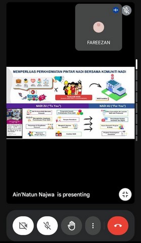6 November 2024 | Aktiviti Terkini05 November 2024, Selasa – Taklimat Perkhidmatan Pintar NADI bagi Penolong Pengurus Wilayah Tengah telah diadakan pada Selasa yang lalu. Fokus utama taklimat adalah untuk memberikan penerangan tentang aktiviti dan peranan baru untuk petugas NADI. Taklimat diadakan selama 8 jam bermula 9.30 pagi sehingga 5.30 petang yang dilakukan secara atas talian menggunakan aplikasi Google Meet.