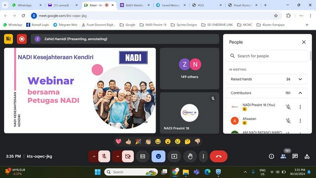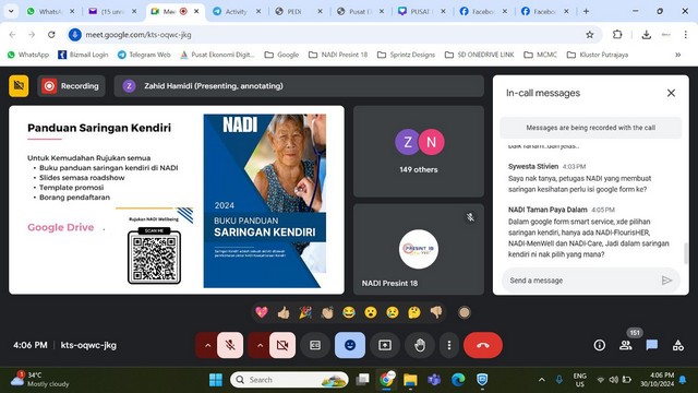 31 Oktober 2024 | Aktiviti Terkini30 Oktober 2024, Rabu – Webinar Wellbeing Support telah diadakan secara atas talian kepada petugas NADI di seluruh negara. Petugas diberi penerangan mengenai perkhidmatan baru yang akan disediakan di NADI iaitu saringan kesihatan seperti pemeriksaan BMI, tekanan darah dan bacaan gula dalam darah. Program ini untuk meningkatkan kesedaran komuniti mengenai kepentingan penjagaan kesihatan diri melalui pemeriksaan berkala. Seterusnya sesi soal jawab diadakan untuk membantu petugas mengenai isu dan permasalahan mengenai program saringan kesihatan.
