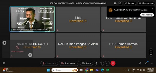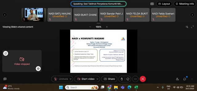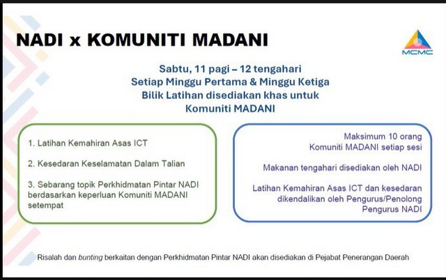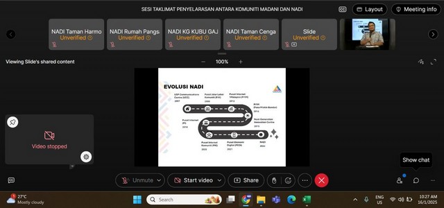 17 Januari 2025 | Aktiviti Terkini16 Januari 2025, Khamis – Taklimat mengenai cadangan kerjasama antara pihak Suruhanjaya Komunikasi dan Multimedia Malaysia (MCMC) menerusi rangkaian semua NADI di seluruh Malaysia dan Jabatan Penerangan Malaysia (JAPEN) telah diadakan secara dalam talian menggunakan Webex kepada petugas NADI seluruh Malaysia.