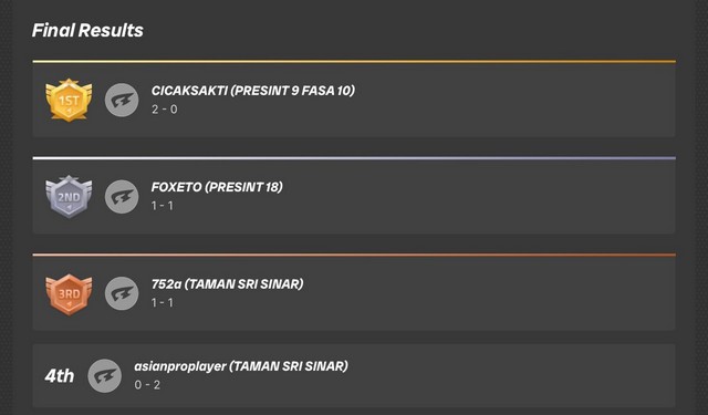 Perlawanan dimulakan pada jam 10.00 pagi bertemu wakil pemain daripada NADI Presint 9 Fasa 10 dan peroleh kemenangan pertama tanpa bertanding. Perlawanan kedua bertemu pemain NADI Presint 16. Seterusnya menentang NADI Taman Sri Sinar pada pusingan ketiga. NADI Presint 18 telah mara ke separuh akhir menentang NADI Taman Sri Sinar dan berjaya mengalahkan mereka untuk ke peringkat akhir. Foxeto wakil NADI Presint 18 telah berjaya mendapat naib johan untuk peringkat negeri ini sekaligus memenangi wang tunai berjumlah RM300.00